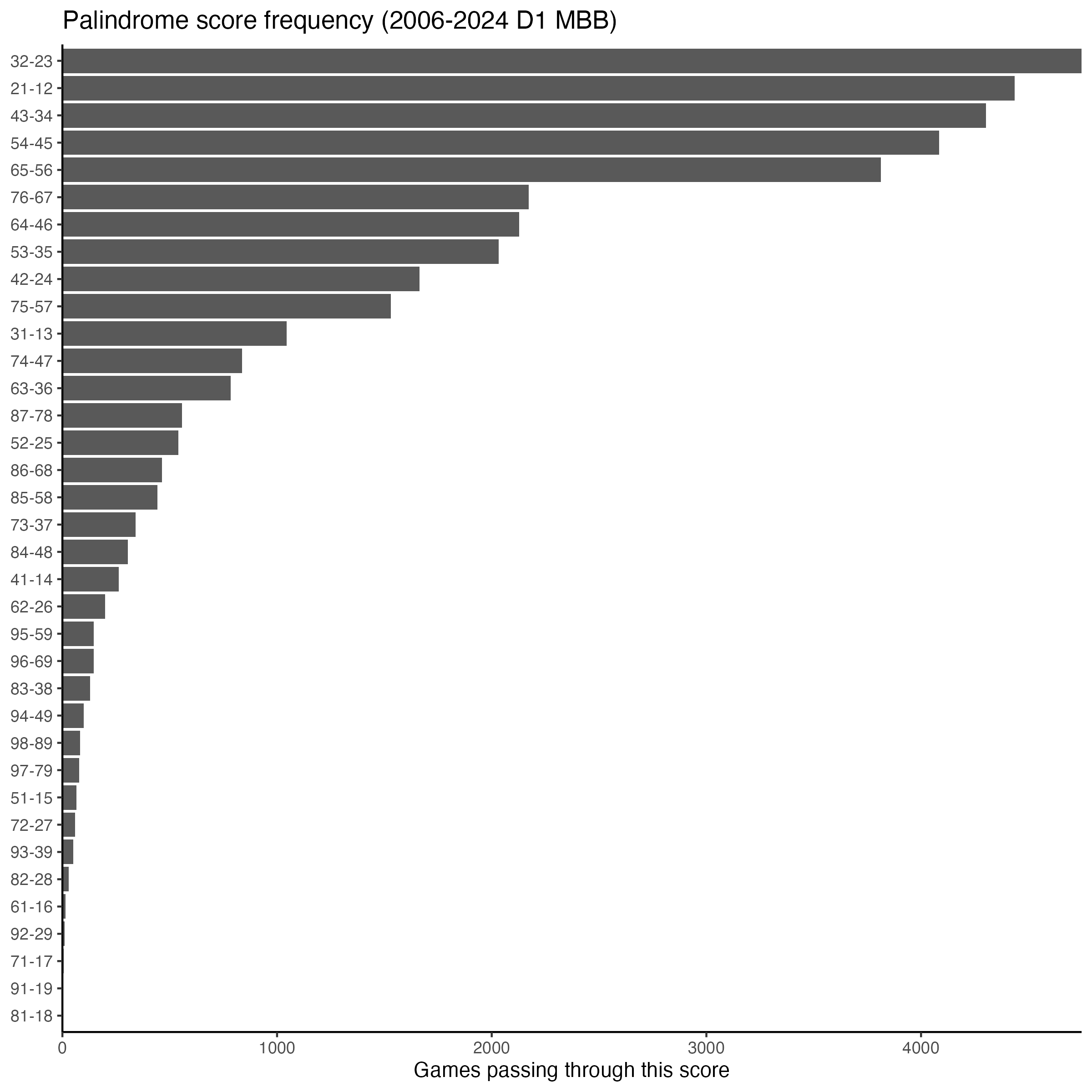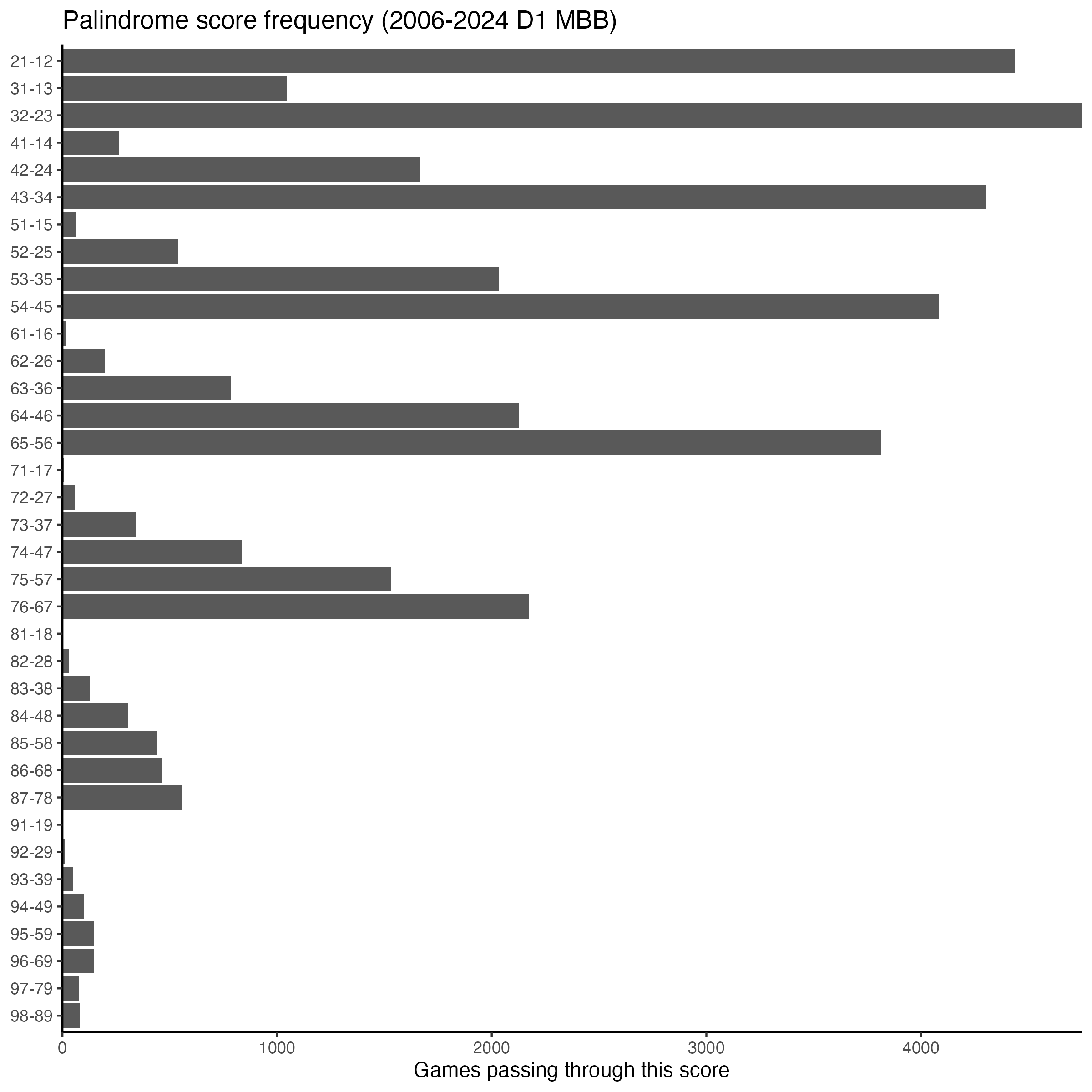 You might wonder about Michigan’s 74-47 moment against Arizona? That palindrome appears in about 800 games in the dataset. Not the rarest palindrome, but not exactly common either—well-suited for a game where one team was putting on a historically dominant performance.