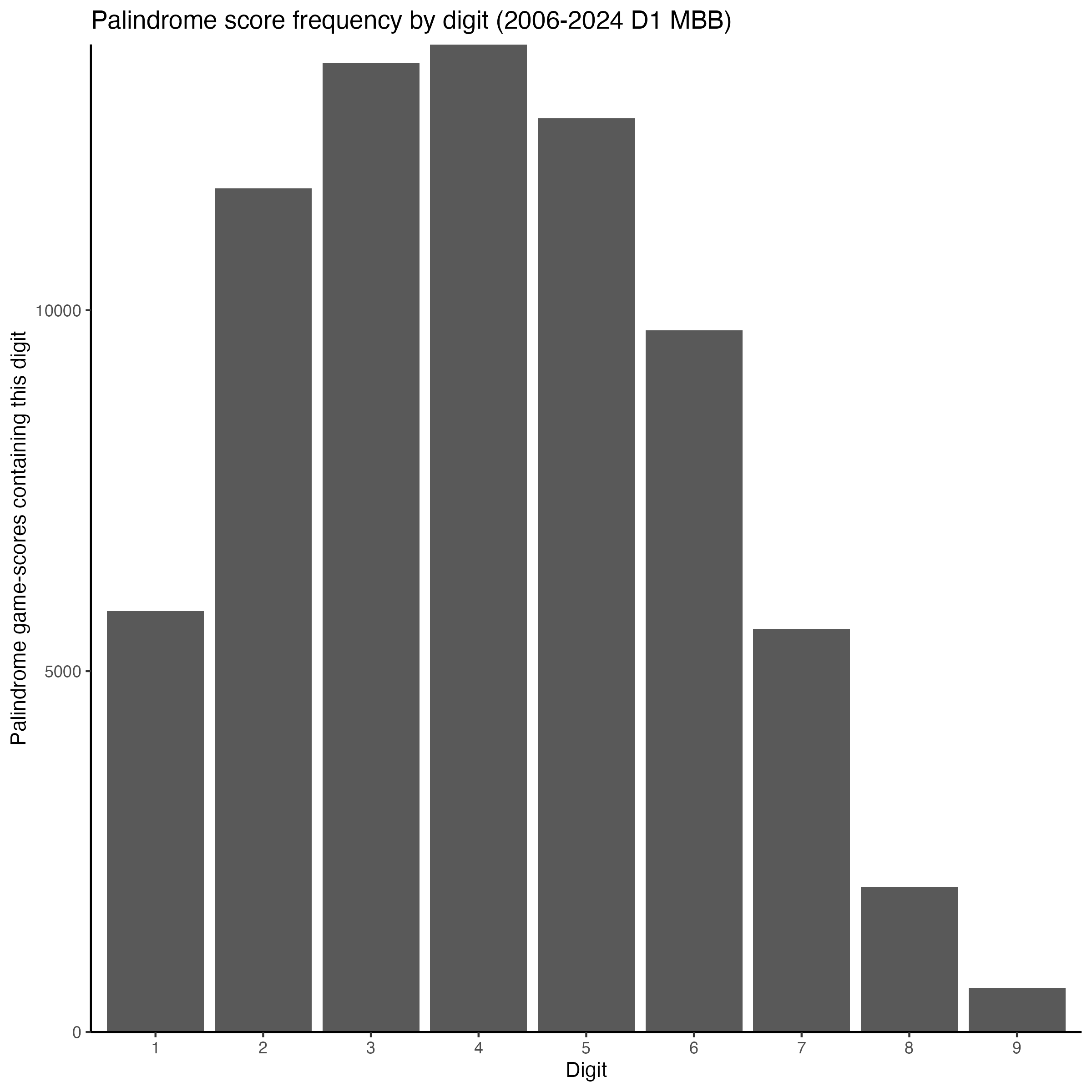 Digits 3, 4, and 5 dominate. This again reflects where in a basketball game palindromes are most likely to happen: the 30s, 40s, and 50s represent the sweet spot where both teams have enough points for two-digit scores but the game hasn’t stretched into blowout territory. The falloff toward 8 and 9 reflects the rarity of high-scoring palindromes.