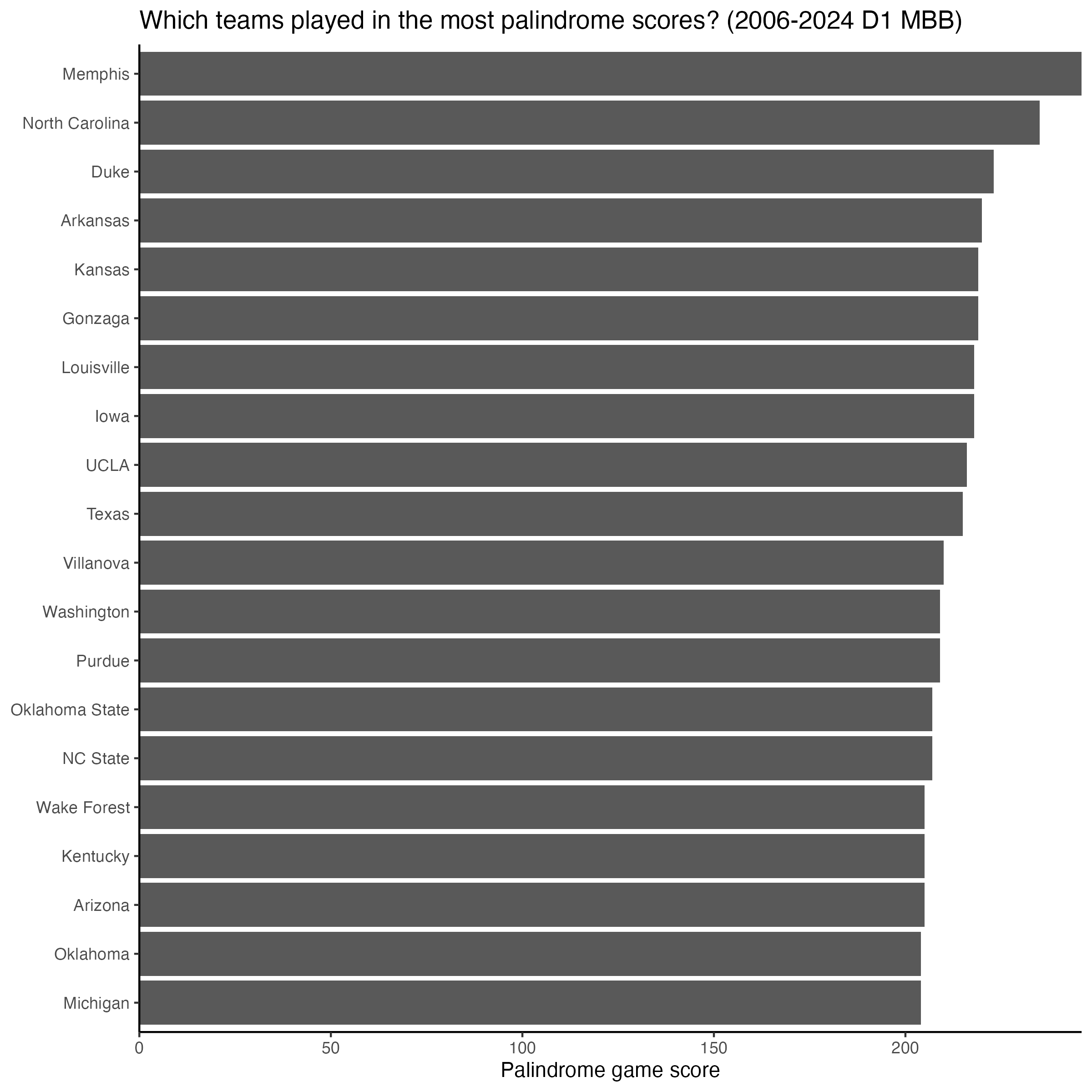 Finally, for more fun: which teams have played in the most games that passed through a palindrome score? This is mostly a proxy for “which teams play the most games” (and therefore have the most chances), which is itself a proxy for which programs have been consistently good enough to make deep tournament runs and play in televised games over this period, but maybe there is maybe some variation to assess amongst the top!
