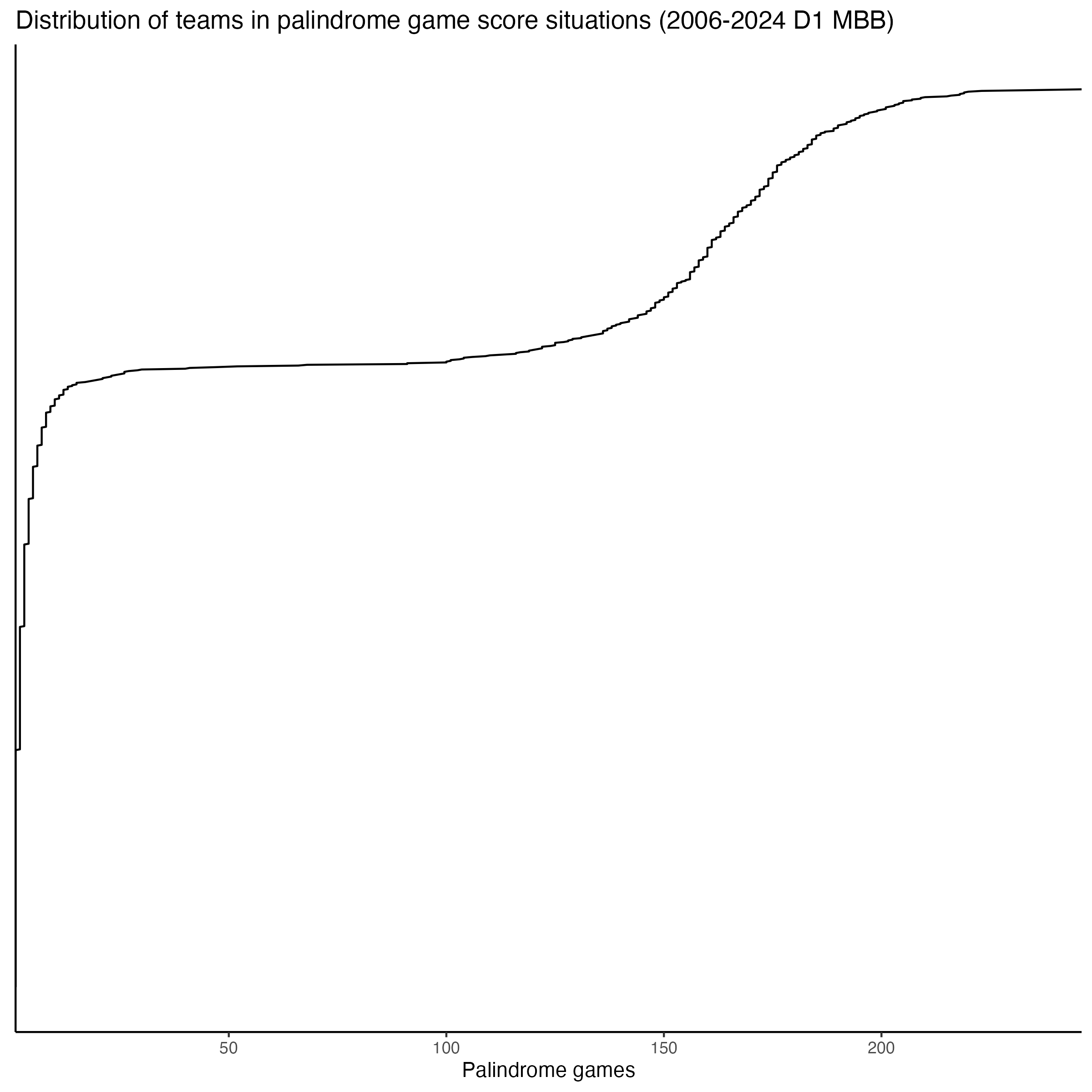 Memphis, North Carolina, and Duke lead the way, none of which is surprising. But Memphis has been in 246 palindrome score situations, fully 11 and 23 more than its followers. The full distribution of all teams is pretty funky looking but shows the expected long right tail: